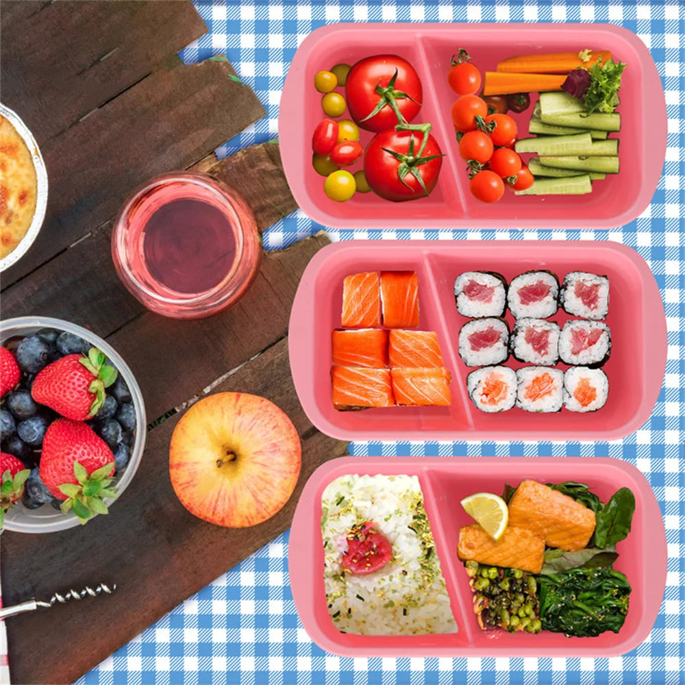 - Two-grid design keeps foods neatly separated while the stackable lids maximize space in your lunch bag or kitchen cabinet, preventing cross-contamination.