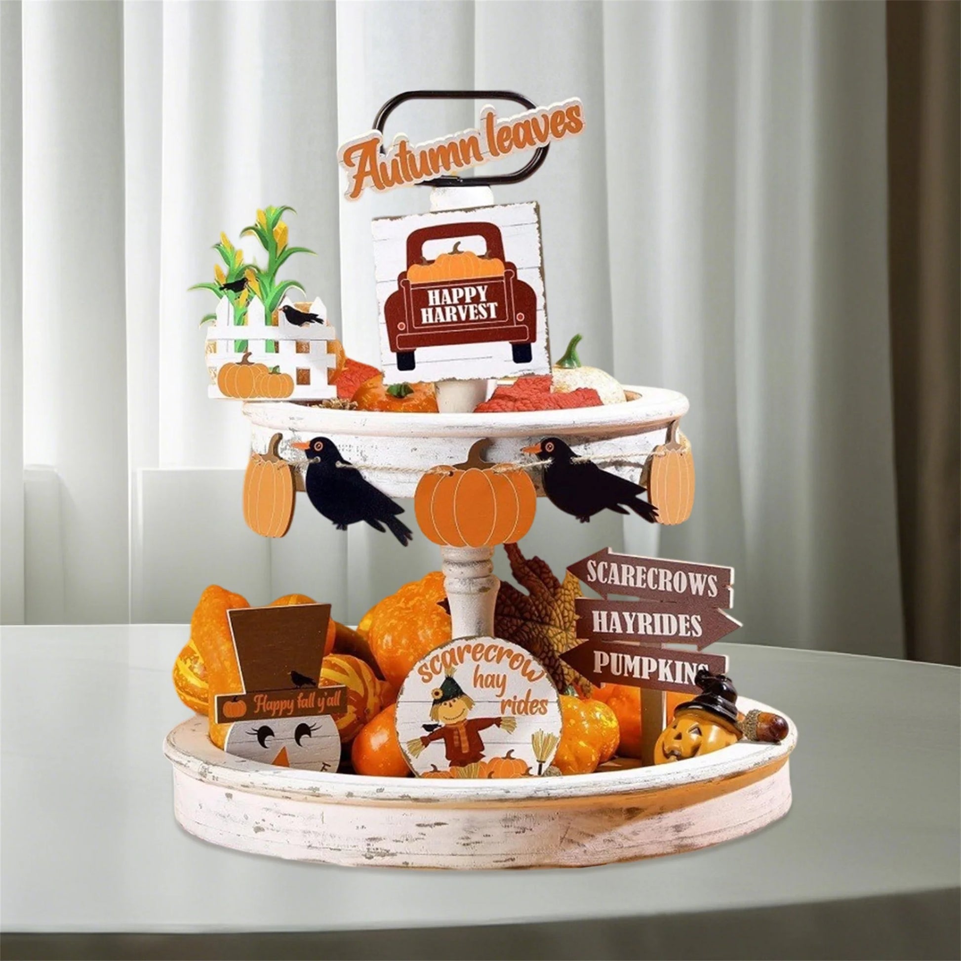 Hign-concerned Fall Harvest Tiered Tray Decor Pumpkin Crow