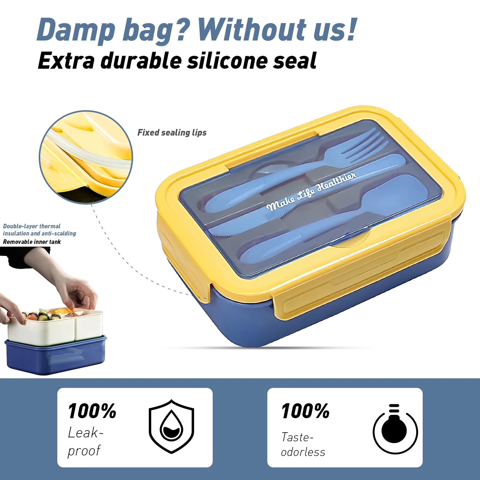 - Layered compartments with a secure silicone sealing ring prevent flavor transfer and keep your snacks neat, while compartmentalisation supports separate portions for balanced meals and a wipe-clean interior.